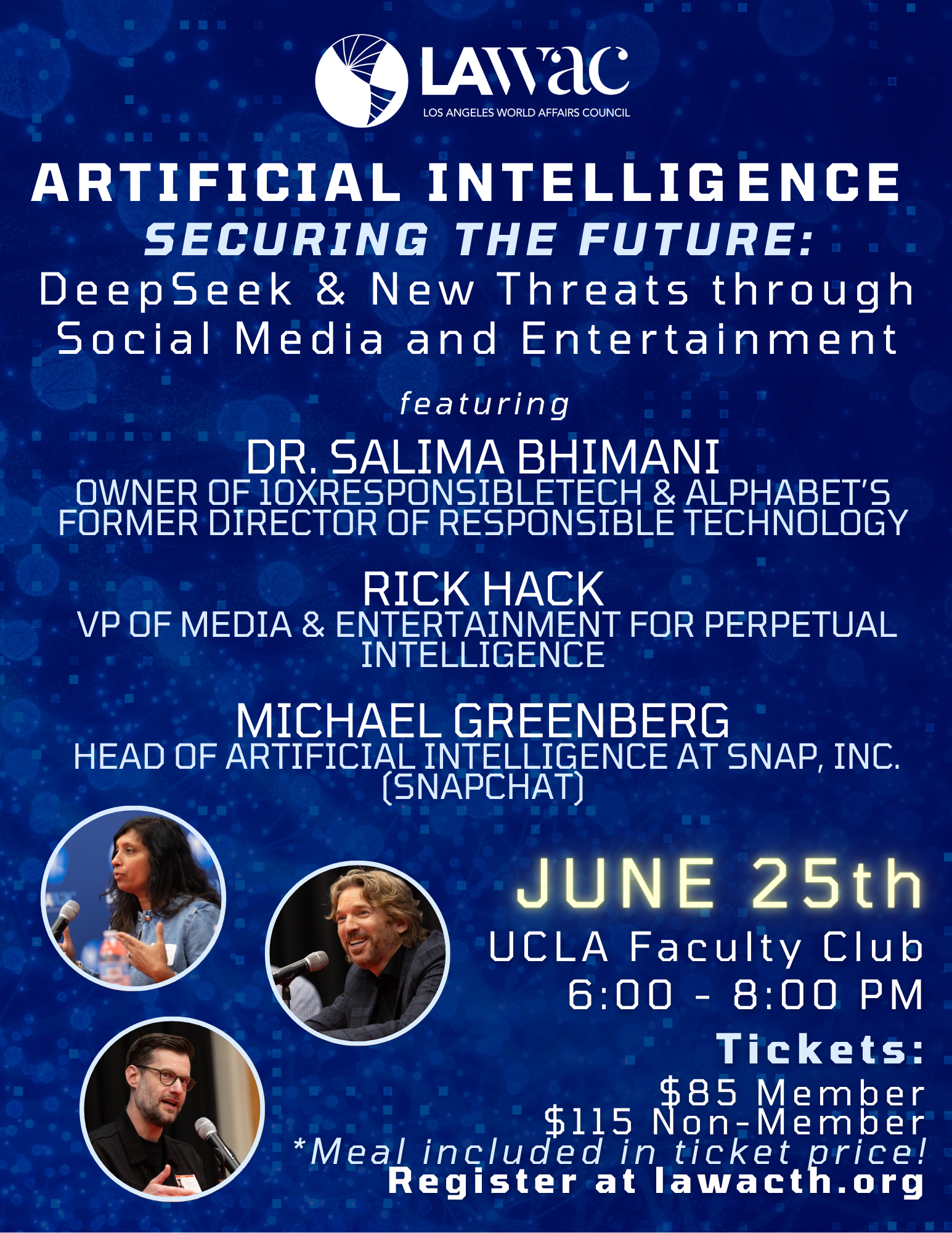Following the success of our April High School Program, LAWAC is excited to welcome back an extraordinary panel of experts for "Artificial Intelligence: Securing the Future – DeepSeek & New Threats Through Social Media and Entertainment" on June 25th from 6:00-8:00 pm at the UCLA Faculty Club.