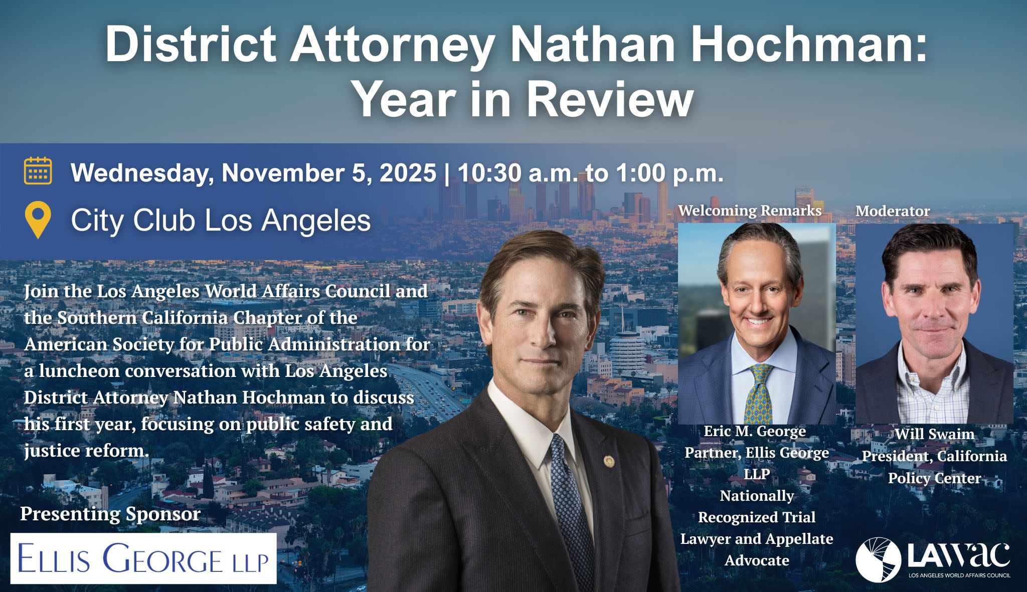 The Los Angeles World Affairs Council, in partnership with the American Society for Public Administration (ASPA), is pleased to present a luncheon and conversation with Los Angeles County District Attorney Nathan Hochman. Marking one year since his election, this “year in review” discussion will highlight Hochman’s reflections on his first year in office—progress made, challenges faced, and priorities moving forward.