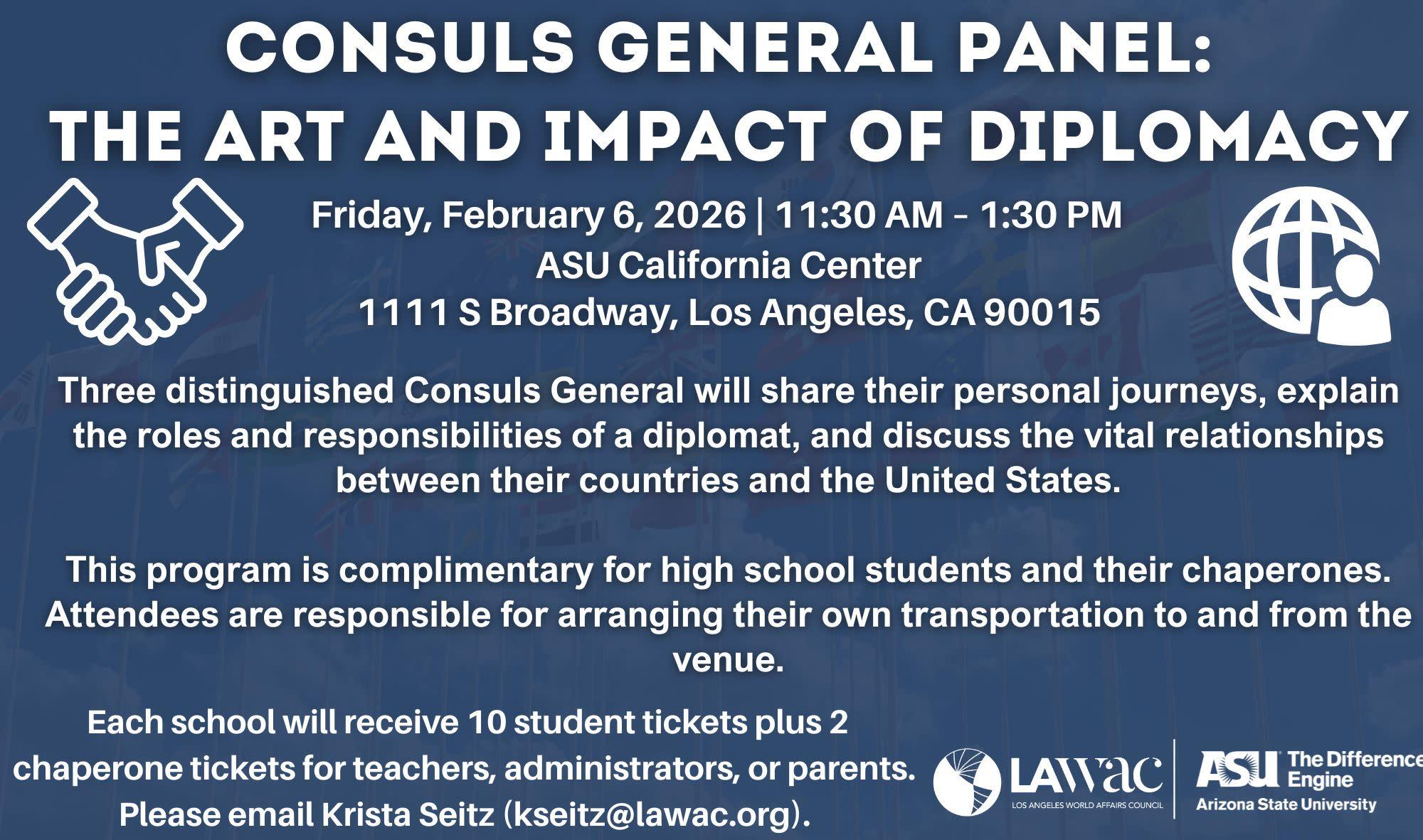 The Los Angeles World Affairs Council is proud to partner with our co-host, The Difference Engine at Arizona State University, for a special high school program, "The Art & Impact of Diplomacy", on Friday, February 6 from 11:30 am to 1:30 pm at the ASU California Center in Downtown Los Angeles.