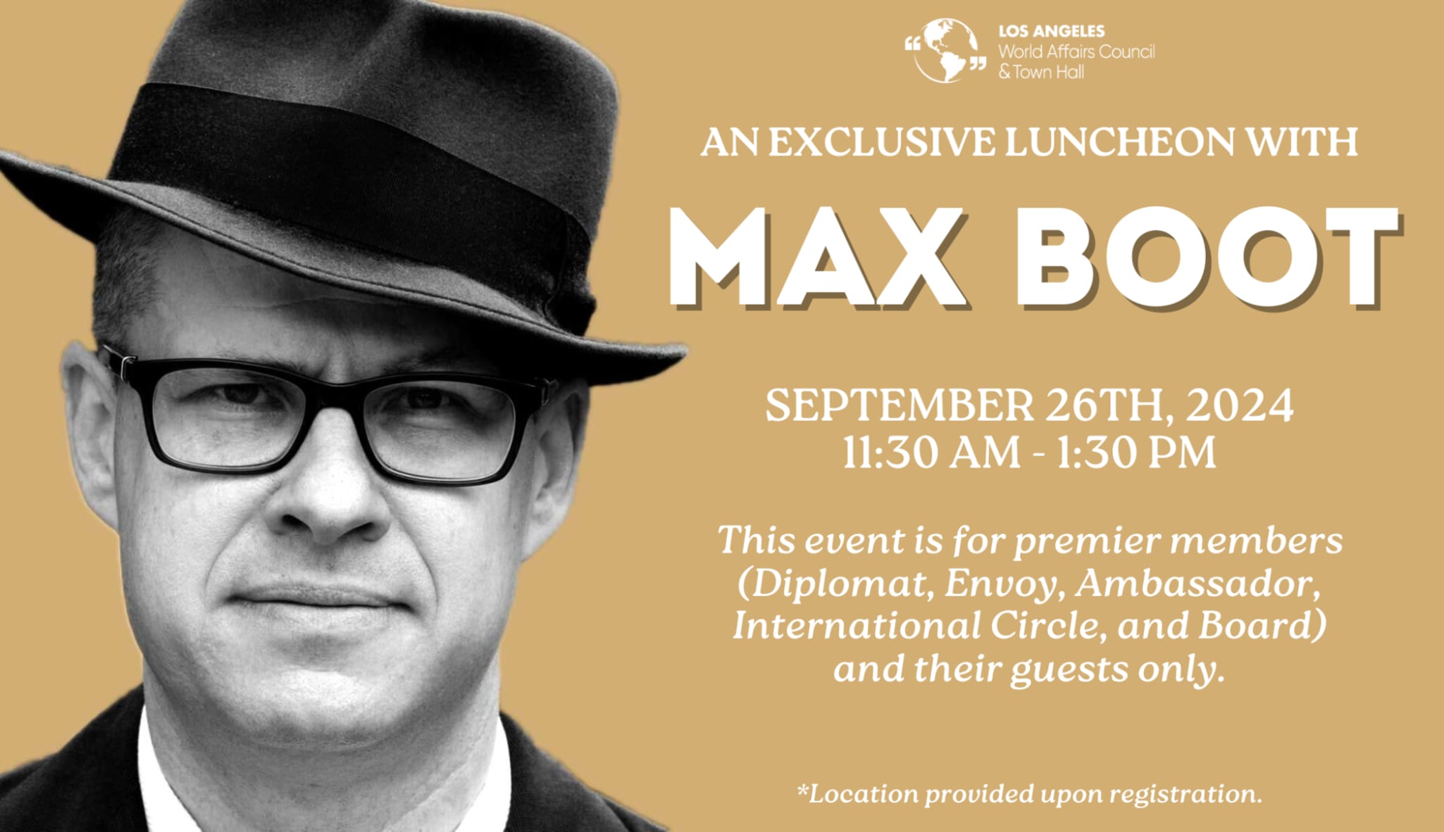 DESCRIPTION:The Los Angeles World Affairs Council hosted an exclusive luncheon and conversation with Washington Post columnist and Council on Foreign Relations Senior Fellow for National Security Studies Max Boot on his book\, Reagan: His Life and Legend.\nView the photos from this event HERE.\n\n\nSpeaker: Max Boot  Max Boot is a historian\, best-selling author and foreign-policy analyst. He is the Jeane J. Kirkpatrick senior fellow for national security studies at the Council on Foreign Relations (CFR) and a weekly columnist for The Washington Post.  Boot's new biography of Ronald Reagan\, Reagan: His Life and Legend (September 2024\, Norton/Liveright)\, has been acclaimed as the "definitive biography" (The New Yorker)\, a "magisterial\," "vivid\," and "splendid" account (The Washington Post)\, and a book that "stands out for its deep research\, lucid prose and command of its subject's broad political and social context" (The New York Times). Boot's previous biography\, The Road Not Taken: Edward Lansdale and the American Tragedy in Vietnam\, was a New York Times bestseller and a finalist for the 2019 Pulitzer Prize in biography.  Boot is also the author of four other widely acclaimed books: The Corrosion of Conservatism: Why I Left the Right (2018)\; the New York Times bestseller Invisible Armies: An Epic History of Guerrilla Warfare from Ancient Times to the Present (2013)\; War Made New: Technology\, Warfare\, and the Course of History\, 1500 to Today (2006)\; and The Savage Wars of Peace: Small Wars and the Rise of American Power (2002)\, which won the 2003 General Wallace M. Greene Jr. Award from the Marine Corps Heritage Foundation as the best nonfiction book pertaining to Marine Corps history and has been placed on military professional reading lists.  Boot has been a CNN global affairs analyst and a regular guest on MSNBC\, NPR\, BBC\, and many other radio and television programs. He was named in 2018 one of America's "Great Immigrants" by the Carnegie Corporation and one of the 50 most influential Jewish Americans by the Forward newspaper. Boot served as a foreign policy adviser to the presidential campaigns of John McCain\, Mitt Romney\, and Marco Rubio.  Before joining the Council on Foreign Relations in 2002\, Boot was the op-ed editor at The Wall Street Journal and\, before that\, an editor and writer at the Christian Science Monitor. He has also been a regular contributor to the Los Angeles Times\, USA Today\, the New York Times\, Foreign Policy\, Commentary\, and many other publications.  Boot holds a bachelor's degree in history\, with high honors\, from the University of California at Berkeley (1991) and a master's degree in history from Yale University (1992). He was born in Moscow\, grew up in Los Angeles\, and now lives with his family in New York City.  Moderator: Dr. Richard Downie  Richard Downie is President & CEO of the Los Angeles World Affairs Council & Town Hall. He is also on the faculties of the Thayer Leader Development Group at West Point and Missouri State University's Defense and Strategic Studies Program. Additionally\, he chairs the Pacific Council on International Policy's Mexico Initiative Advisory Board\, and serves on the Boards of the World Hwa Rang Do Association and Westport Construction Inc.\, He is a member of the Council on Foreign Relations. A graduate of the United States Military Academy (USMA) at West Point (Class of 1976)\, he holds an M.A. and Ph.D. in International Relations from the University of Southern California.   Previously\, Dr. Downie served for nine years as the Director (SES-3 level) of the William J. Perry Center for Hemispheric Defense Studies in Washington\, D.C.\, the Department of Defense's regional security center for the Americas. At the Perry Center\, he led a wide variety of courses\, seminars and conferences on security and defense topics\, as well as dialogues and workshops for ministries of defense and cabinet-level national leaders. During a distinguished military career\, he held a wide variety of command and staff positions\, serving as an Infantryman and as a Foreign Area Officer specializing in Latin America. Dr. Downie had several assignments in Germany\; was an exchange officer in Colombia\, where he completed the LANCERO (International Ranger) School as the distinguished graduate\; worked at both the U.S. Army South and the United States Southern Command in Panama\; coordinated Western Hemisphere affairs on the U.S. Joint Staff\; served with the Multinational Specialized Unit in Bosnia\; and was the Defense and Army Attach  in Mexico. His final U.S. Army assignment was in command of the Western Hemisphere Institute for Security Cooperation (WHINSEC)\, where he served as the Institute's first Commander. Dr. Downie authored Learning from Conflict: The U.S. Military in Vietnam\, El Salvador and the Drug War\, Greenwood Press\, as well as numerous scholarly articles and other publications. His military education includes the U.S. Army War College\, the U.S. Army Command and General Staff Course and the Defense Strategy Course. He was also a Fellow in the Massachusetts Institute of Technology's Seminar XXI Program.   His numerous US and foreign awards and decorations include: the Defense Superior Service Medal\, the Legion of Merit\, the Defense Meritorious and the Meritorious Service Medals\, the Joint Service and Army Commendation and Achievement Medals\, the Army Expeditionary Medal\, the Inter-American Defense Board Medal\, the Order of Military Merit (Colombia)\, the Bosnia/ Former Yugoslavia NATO Medal\, the Order of Military Merit (Mexico)\, the Order of the Peruvian Cross (Peru)\, the Order of Merit for Democracy\, Grand Knight level (Colombia)\, the Superior War College Medal (Colombia)\, the First Medal of Laws (University of Nuevo Leon\, Mexico)\, and the Order of St. Maurice (Cdr-level).
