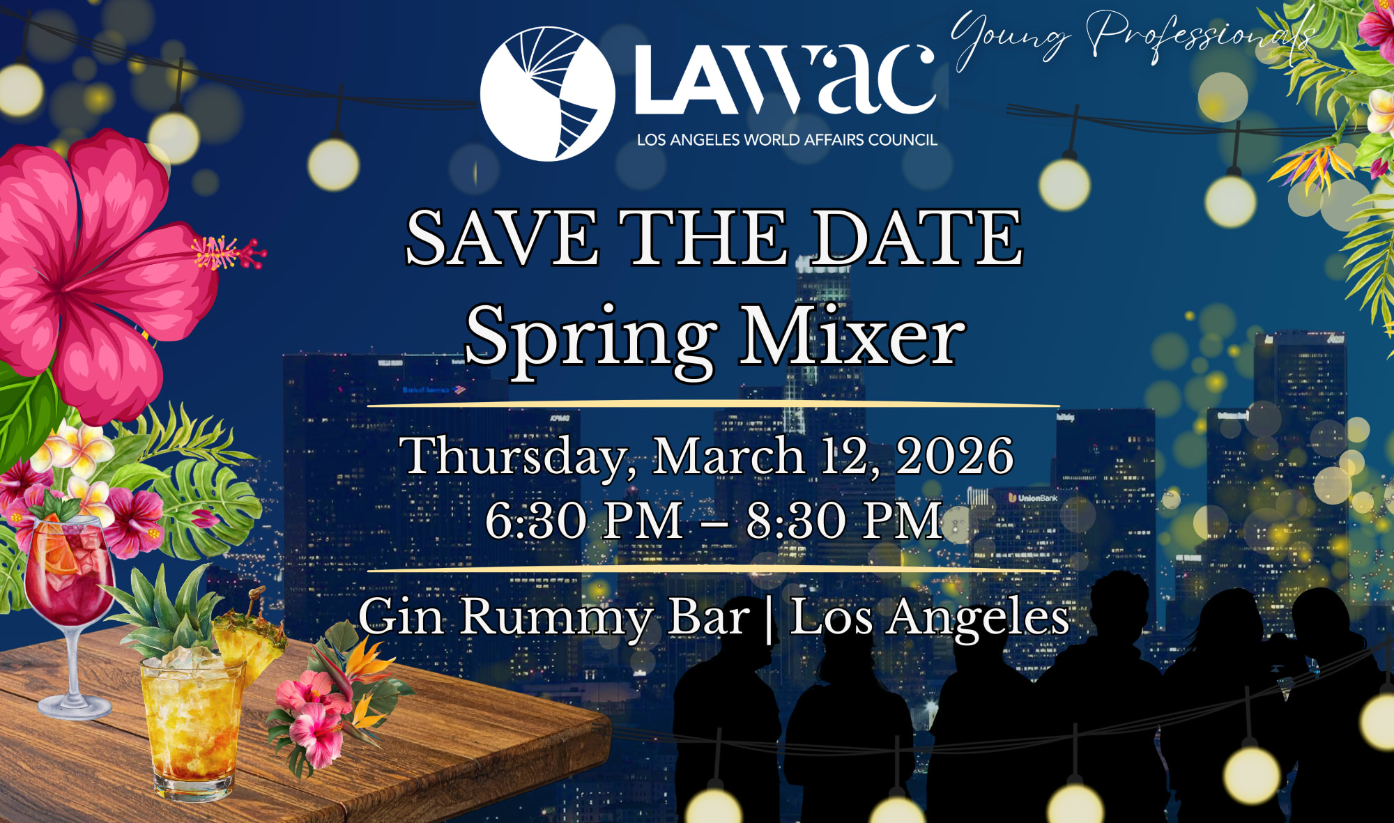 Join the Los Angeles World Affairs Council Young Professionals for our Spring Mixer on Thursday, March 12th 6:30-8:30 pm at Gin Rummy bar. Meet a diverse group of globally-minded Angelenos who love talking about current events, travel, and new ideas—or just come to mingle in a fun, festive setting.
